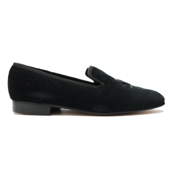 アッパー素材は高級感溢れるブラックベルベットに同色の刺繍を施して落ち着いたトーンで仕上げ、