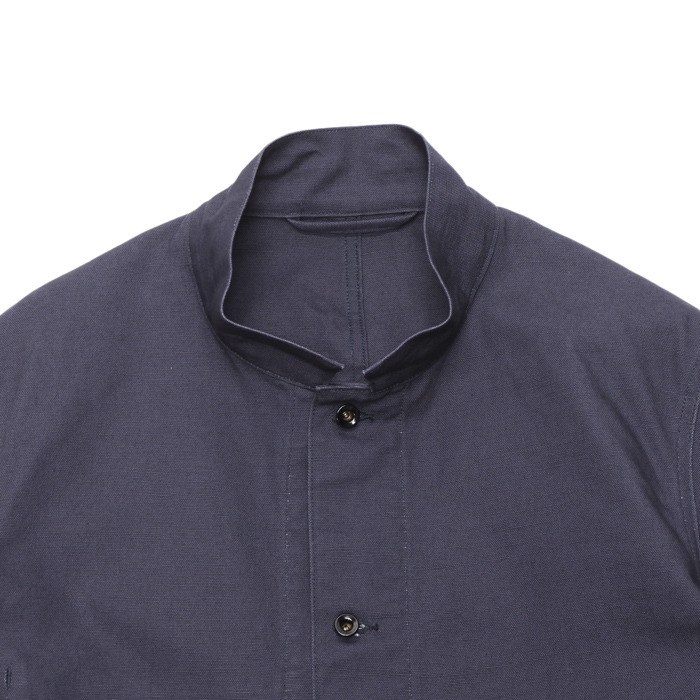 当時の襟型を参考にされた直線的なパターンのスタンドカラーに、全体にゆとりのあるシルエット、