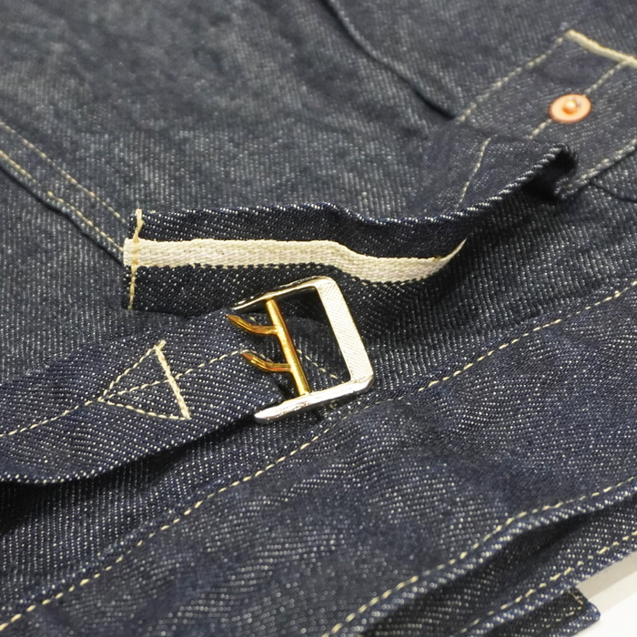 裾部分には真鍮製の2本針バックル、フロント見返し部分のセルビッチをはじめ
