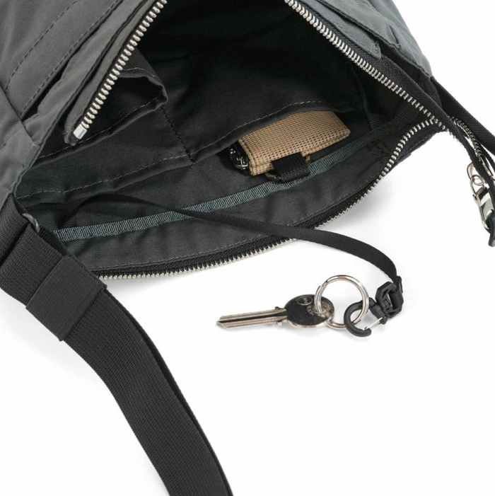 背面にはホック付きのポケット、メインスペースの前面側には仕切りポケットとキーストラップを配し