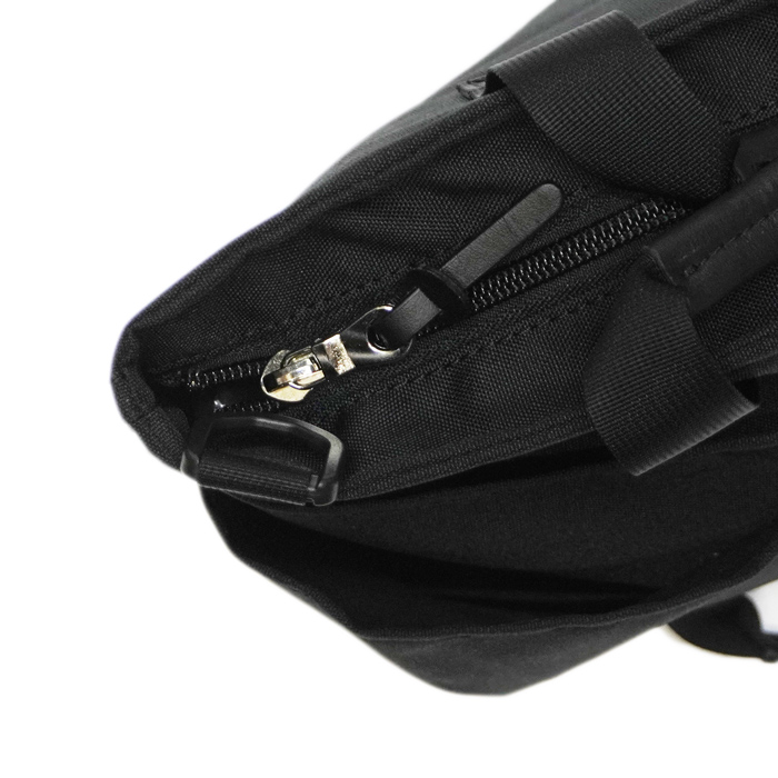 背面側にはファスナー仕様の吊りポケットを取り付け、口元と底の内側には補強生地を当てることで強度を保たれています。