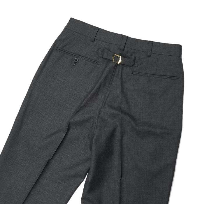 パイプドステムと呼ばれる美しいストレートシルエットにバックストラップ(尾錠)が付属したトラウザーズです。